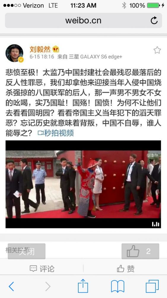 “悲愤至极!太监乃封建社会最残忍最落后的反人性罪恶,我们却拿来迎接当年入侵中国烧杀掠夺的八国联军的后人,那一声不男不女的吆喝,实乃国耻!国殇!国愤!为何不让他们去看看圆明园?看看帝国主义当年犯下的蹈天罪行?忘记历史就意味着背叛。中国不自辱,谁人能辱之?”