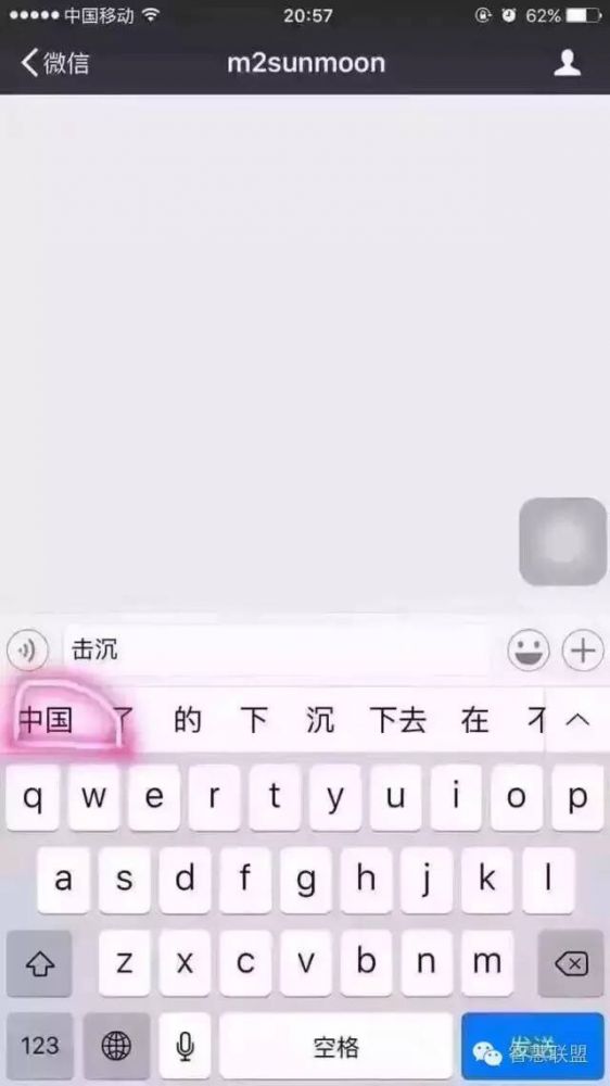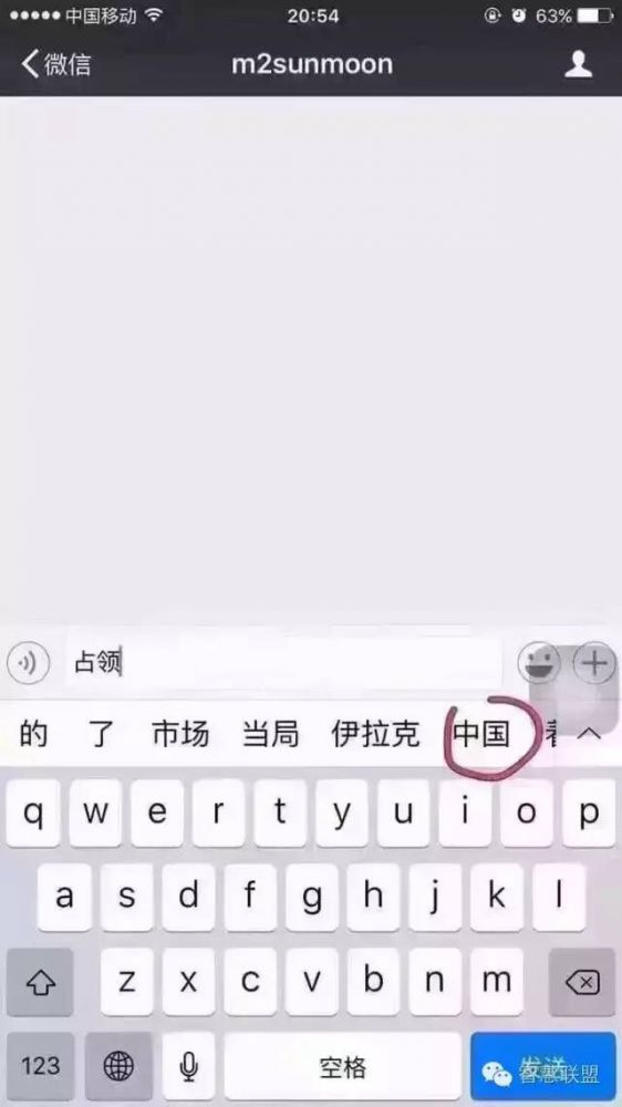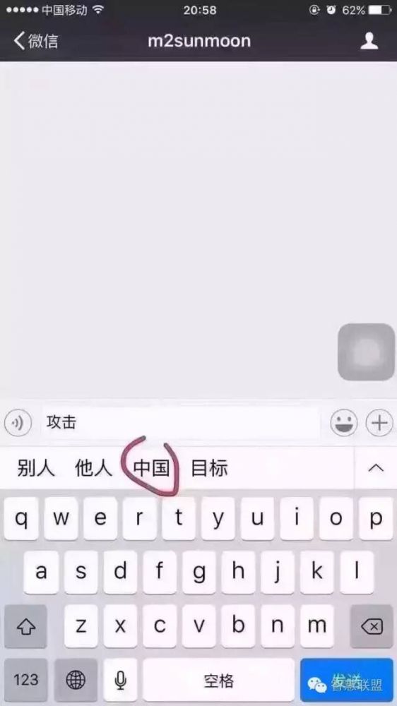 今天早晨我在微信朋友圈看到一个高中同学转的一个帖子,标题是“奇耻大辱!苹果辱华输入法让13亿中国人恕火中烧!”。该文指出,用苹果手机自带的中文输入法输入侵略、击沉、轰炸、占领等词语,后续的智能提示字词中总会出现“中国”(见下图),所以该文作者下结论认为苹果中文输入法故意辱华,号召全体中国人民抵制苹果产品,改用国产替代品。于是,我用自己的手机试了一下,果真如此。至此,如果我不作进一步的考证,真的就相信了该文作者的观点,真的认为苹果的中文输入法辱华,也会忿忿不平,把自己的手机摔得粉碎。