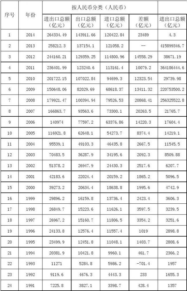 如果你还不信,让我们再看看中国方面的统计数据。下图是中国从1991年至2014年间历年进出口总额和差额的统计数据,数据来自中国国内网站。