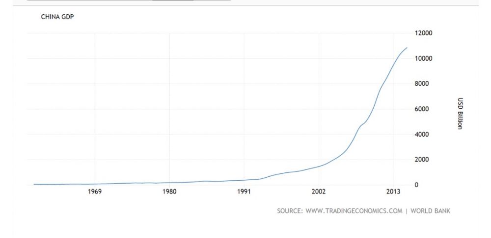下图是中美从1985年至2015年30年间的贸易顺差额趋势图,数据来自美国国家统计局官网(www.census.gov)。三十年间中国通过货物贸易总共从美国赚取了4万多亿美元的顺差,解决了上千万城镇下岗职工和数亿农村剩余劳动力的就业问题,为中国的经济发展注入了巨大的外汇储备用以进口经济发展必需的铁矿石和石油天燃气等战略物资。从中美贸易顺差额图中,我们可以看出,自2002年起,顺差额成直线加速上升趋势,因为2001年中美经过多年多轮谈判美国终于同意中国加入世贸组织。图中还有一个有重要意义的现象是2009年中美贸易顺差突然比2008年下降了400多亿美元,这主要归因于2008年美国发生了次贷危机,导致经济衰退,进口需求减少。我们再看看同期中国GDP增长情况,数据和图来自www.tradingeconomics.com。对比两个图,我们发现中国GDP与中美贸易顺差额之间存在正比关系。所以,我们可以毫不夸张地说,中国的崛起基本上拜全球化之赐,我们只不过是抓住了这个机会,搭上了全球化的便车。