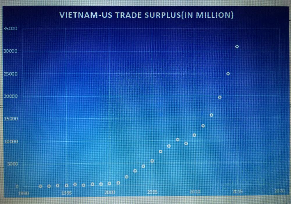 如果有人欲挑战这个结论,那我再举一个越南的例子。越南与中国同属社会主义阵营,是中国的小弟弟,曾经与美国敌对了三十多年。越南也学大哥与美国眉来眼去、暗送秋波。自从1995年美国与越南恢复外交关系后,越南对美贸易顺差也经历了快速增长期(见下图),尤其是2009年越南加入世贸组织后,增长更为迅速。而同期越南GDP的增长与对美贸易顺差额增长也成正比关系。