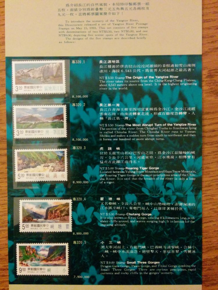 这个台南人听说我们是集邮门外汉,又跟我们讲了很多集邮的知识,除了邮票的图案,其他像齿孔,面值,名称,铭记等都很重要。他的讲解让我们对集邮产生了兴趣。当时,看到一套长江风光邮票(图),一套5枚, 包括长江源地区,长江第一湾, 虎跳峡, 翟塘峡和小三峡。邮票制作很精美,风景也拍的好,当时就买了一套,这也成了我们集邮的第一套邮票。这套邮票现在虽然价值不高,但却给我们打开了一个全新的世界。