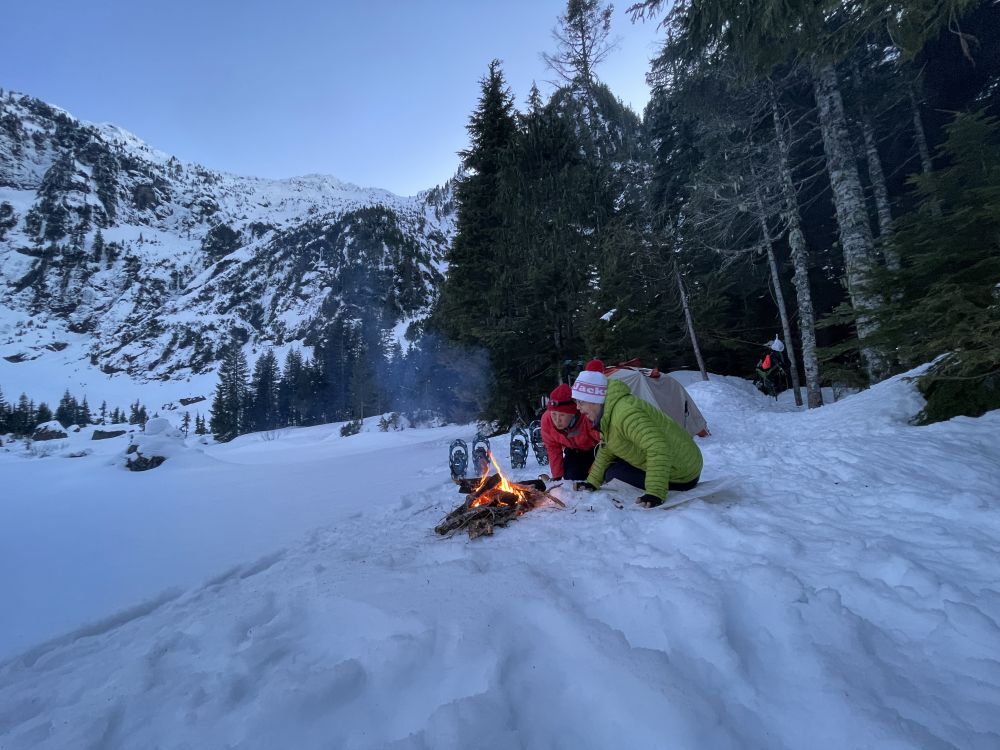 雪地点火不容易,也没有东西扇风,我们齐心协力吹气送氧。