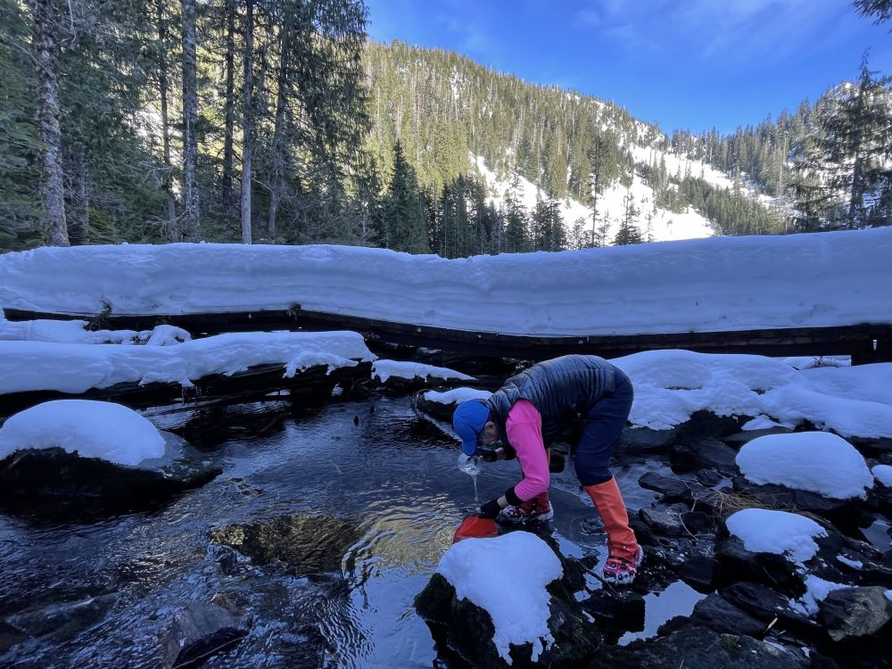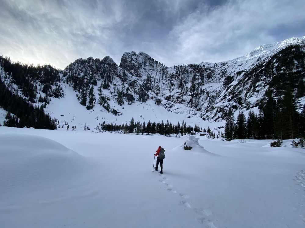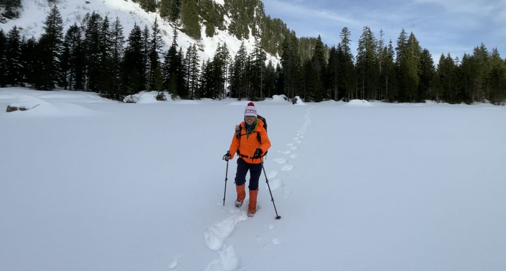 当天往返的登山客最多戴上防滑链,除了我们没人穿雪鞋。我们遇到一组登山的同袍,他们没有防滑链,没有护腿居然绕湖一周,我们就是沿着他们的脚印走了一圈,看到深深浅浅的脚印,深感他们徒步的不易,以我的经验他们的鞋袜一定都会湿透,好在他们不露营否则要遭罪了。