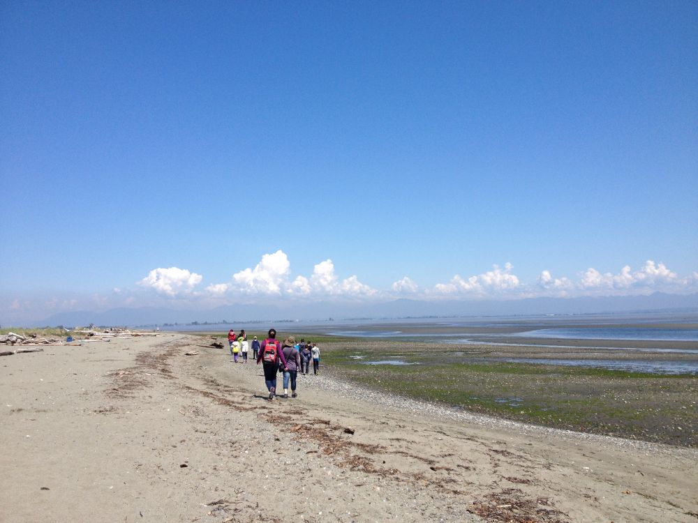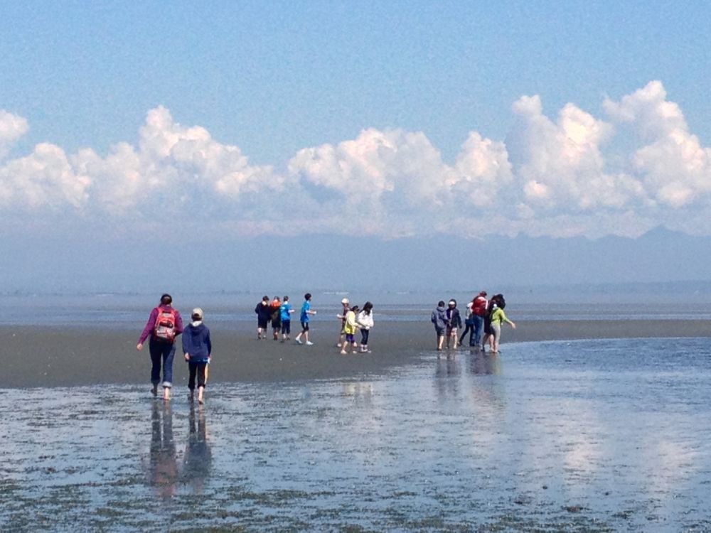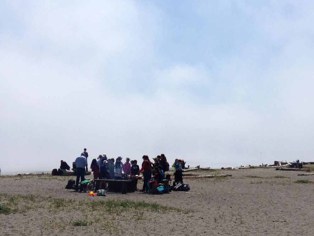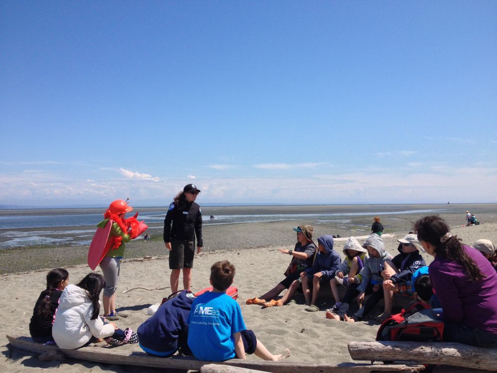 Centennial beach的工作人员Jane带领孩子边讲解边走。尽管雾气很重,但是不影响孩子们学习。Jane先给大家简单介绍了有关潮汐的知识。