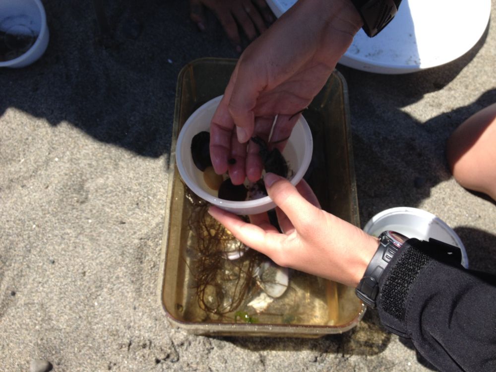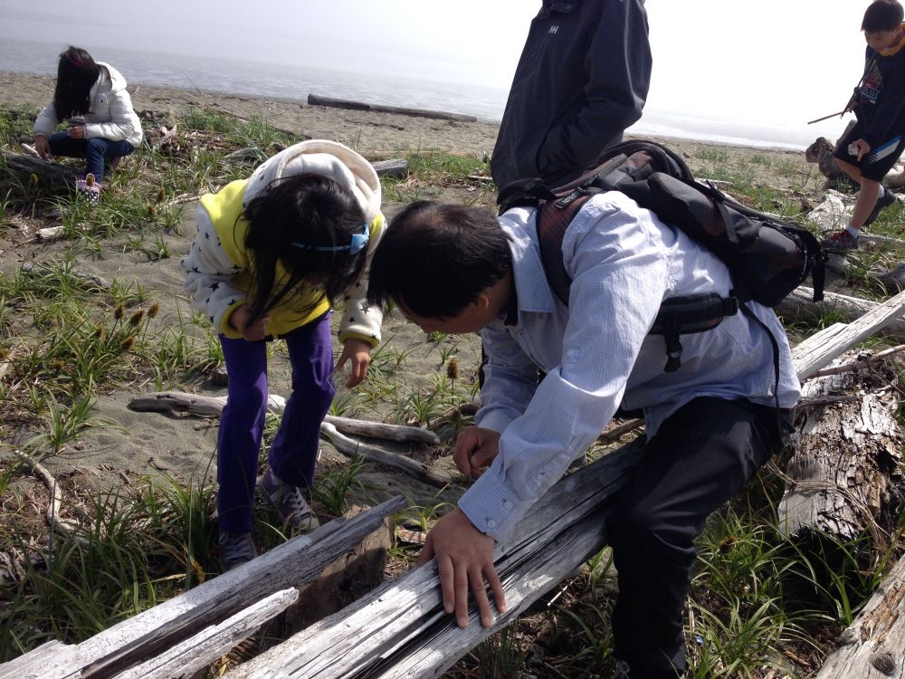 来到海滩上,Jane告诉孩子们,在那些浮木下面,生活着很多小虫子。鼓励孩子们自己去翻开找找看。找到后,先放在透明的小玻璃盒子里。研究完后,就把小虫子们放生。把并且记得把翻起来的浮木恢复成原来的样子。Jane问为什么,有孩子回答,因为破坏了虫子的生活环境。Jane同意并进一步解释,在浮木下面是潮湿的,如果翻起来,虫子就会被晒死和干死。