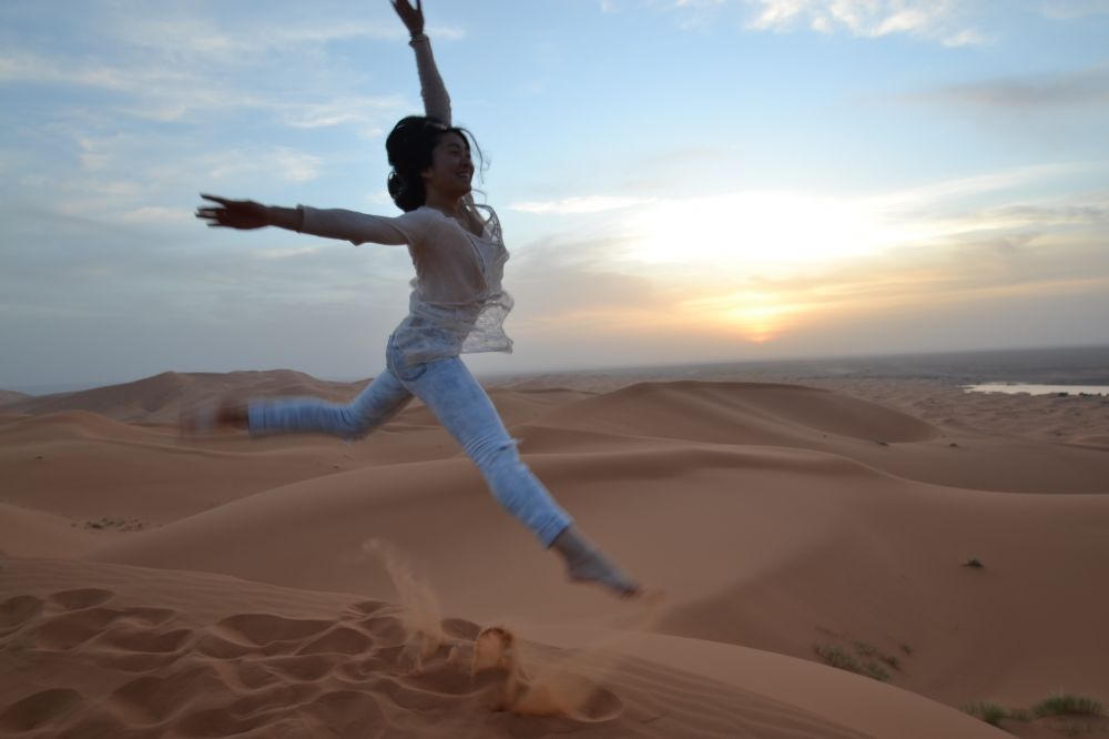 過了一個沙丘到另一個沙丘,層層疊疊,延延綿綿. 在夕陽的餘暉下,金黃色的沙丘倒映著我們的影子。太奇妙啦!
