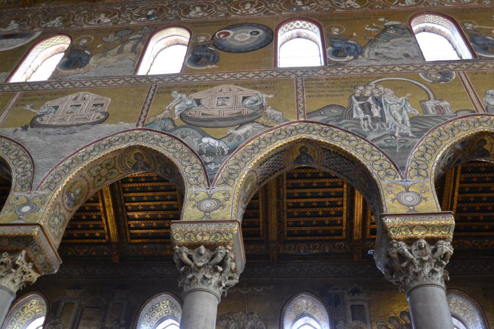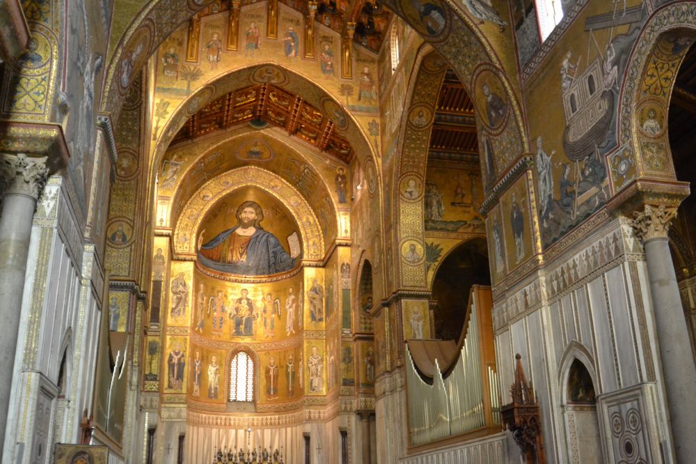 當然最重要的景點便是這座諾曼教堂。1172年由諾曼國王威廉二世所建,後來也作為王室陵墓。外觀為大理石砌成,內部則是描繪舊約聖經故事的黃金鑲嵌畫,共42幅,每幅都栩栩如生。其中最著名的還是半圓壁龕上的“全能的基督”。教堂外也有一座回廊,融合了伊斯蘭和仿羅馬式風格。那天下午一點左右到達這裏,可是要等到三點十五分教堂才開門。進教室看回廊要另買票,那天晚上我們要坐飛機到巴塞羅那,遺憾沒有時間進去看回廊。
