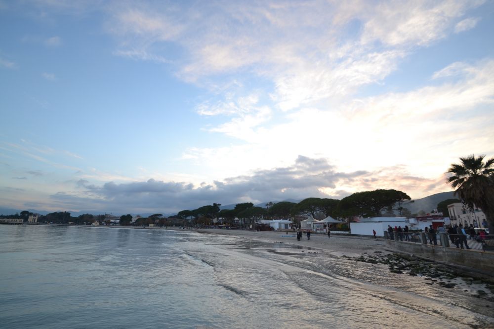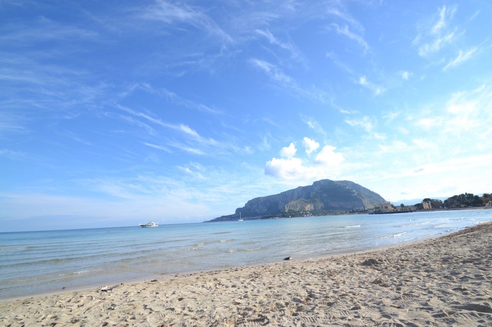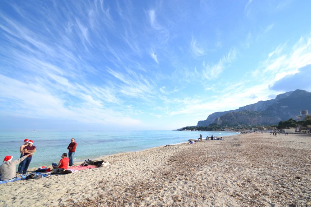 說到大自然的美景我們不得不提到蒙黛羅(mondello),蒙黛羅離巴勒莫有半個多小時的車程,這裏有美麗的海灘,坐巴士806就可以來到蒙黛羅。蒙黛羅其實是個地中海的一處海灣,人們靠打漁為生,也就是所謂的漁村。但它有一個非常漂亮的海灘,海灘被佩勒格裏諾山MONTE PELLEGRINO和加羅山MONTE GALLO環抱其中。我們來的是十二月二十六號,天氣起常的好,一灣湛藍海水和潔白色的沙灘。