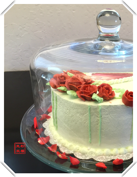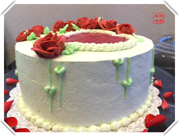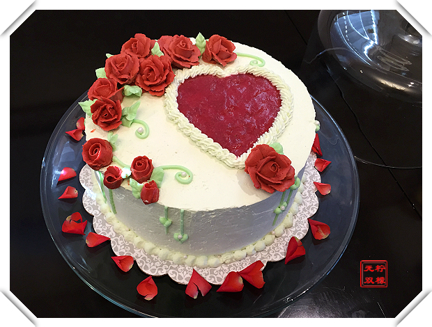 大概从一个月前,我就开始在脑海中无数次构思着这个特殊日子的蛋糕。尽管制作时由于经验不足,经常要临时改变设计以便能够在现有的条件下完成一个完整的蛋糕装饰,但这一次的成品总算基本体现出了我脑海中它的样子。不过颜色和我的初衷还是有很大的出入。本来是想设计一个淡淡的水晶蓝的蛋糕体,配上红色的心形和妖媚的蓝色妖姬玫瑰,可是颜色买的不太对,怎么也调不出靓丽的深蓝色,只好临时加了大红色配成了砖红色,倒是和我的心形草莓酱形成了很好的映衬。以后有机会一定要调出我的蓝色妖姬!