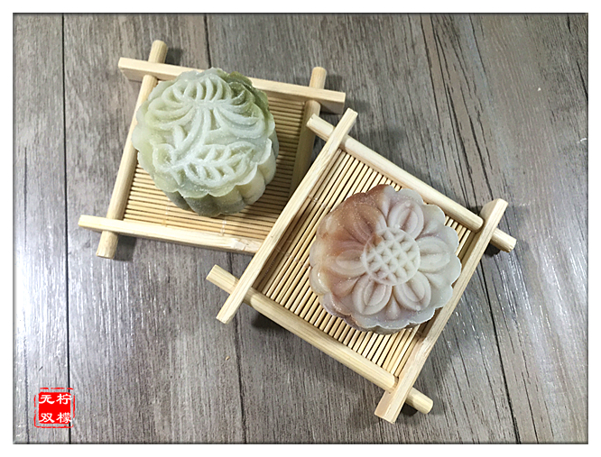 配方中是12个50克月饼的量, 皮馅比例1:1。 如果想发挥一下做成不同颜色和纹路的,最简单的方法是冰皮糊蒸好后加入需要的色素。我采用了比较麻烦但更健康的方法, 就是在蒸冰皮糊前,将少量可可粉或抹茶粉加一点点水调匀,再加入到小部分米粉糊中,分别上锅蒸成不同颜色和口味的冰皮。接下来就发挥想像力随意搭配了 :)。