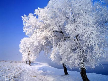 当清晨来临,天比平时亮得早,大地树木都被洒上了一层薄薄的糖霜。空气清澈冷冽犹如一樽美酒,雾不见了,他抱着的那棵枯霭的樱花树上每一节枝干,每一片枯叶,都镀上了晶莹剔透的雾凇,洁白美丽如同一个精雕细刻的艺术品。樱花树一夜之间就这样绽放了,她的枝干上是雪绒一样的雾凇,叶面覆盖着碎晶般的霜花,哪怕最纤细的枝丫也点缀着柔顺的冰茸。人们跑到树下,惊叹着眼前的玉树琼花,他们围着樱花树婀娜的身姿拿出了相机,他们大喊着,雾凇,快看,多美的雾凇啊!