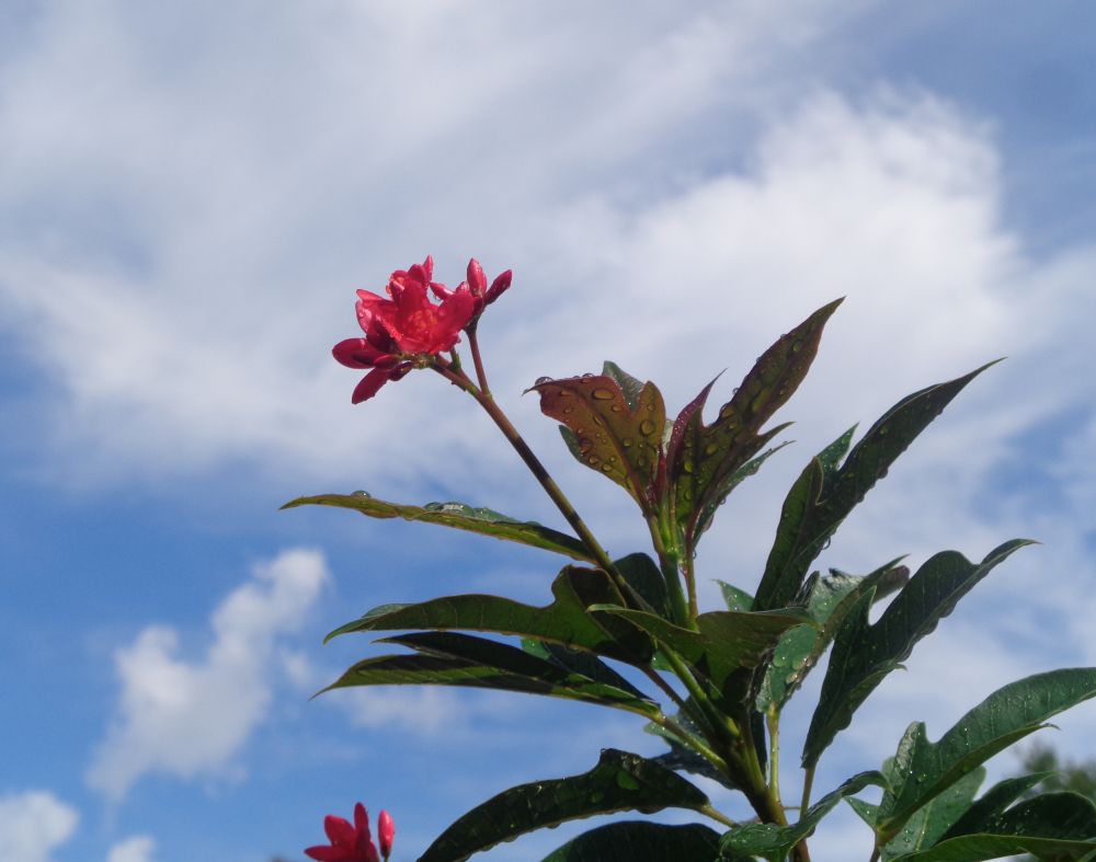 雨后现蓝空,红花绿叶新。偶听鸟轻啼,似喜天放晴。