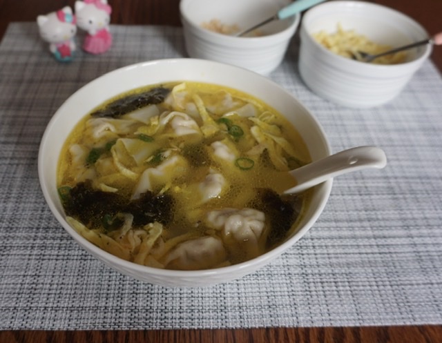 大概我没有写清楚让你误会,我没有发羌饼的图,是餐馆里的墨西哥鸡肉芝士夹饼。这进口的野生黄鱼不知道你们新加坡有没有卖,非常好吃。我的鸡汤小馄饨让我先生真的是吃的非常满意,他说:在家工作来有一顿美味佳肴真的是太好了~~