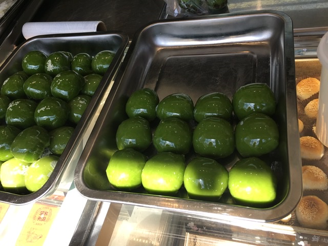 买二个不同口味青团:豆沙和蛋黄肉松