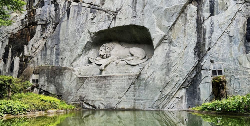 狮子像是为纪念1792年在法国牺牲的瑞士卫兵,被马克·吐温称为“最令人悲伤的石雕” 。由丹麦雕塑家托瓦尔森(Bertel Thorvaldsen)设计,于1821年落成。 这尊雕像刻在岩壁上,描绘一头奄奄一息的雄狮,背部插着断矛,前爪搭在两面盾牌上,一面是法国王室的百合花徽章,一面是瑞士十字。这象征着瑞士卫兵为法国王室而战的忠诚与牺牲。雕像上方刻着拉丁文:“HELVETIORUM FIDEI AC VIRTUTI”,意为献给瑞士人的忠诚与勇敢。这个历史故事, 说的是1792年8月10日,法国大革命期间,巴黎爆发暴动,民众攻入杜伊勒里宫(Palais des Tuileries),试图推翻国王路易十六。瑞士卫兵约1100名受雇保护法国王室,面对数千暴民,他们坚守岗位,誓死不退。结局异常惨烈, 约760名瑞士卫兵战死,幸存的350人中许多人后来也遭处决。因休假而幸存的军官卡尔·费弗(Karl Pfyffer)后来发起建造纪念碑以悼念战友。