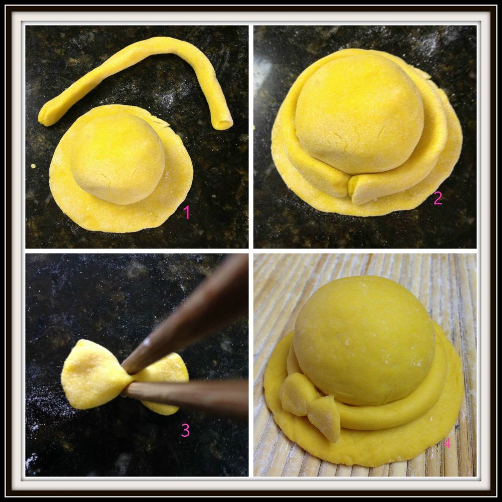 先来做个小礼帽,照着下面的图,先擀一个圆皮,团一个面团,和一条面(图1),然后如图2 所示放在一起。把一块小面用筷子夹成蝴蝶结的形状(图3),后面沾一点水粘在帽子上(图4),这样一个南瓜小礼帽就做成了。