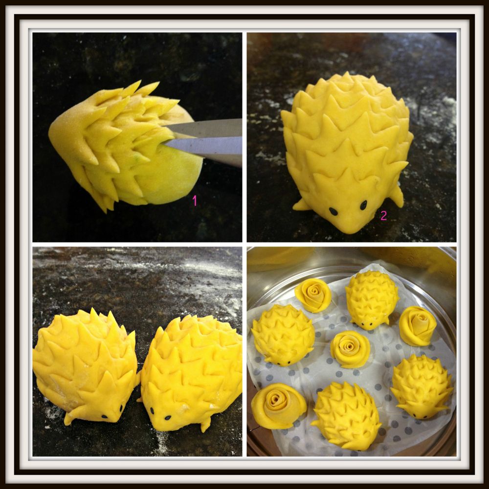 切一块手心大小的南瓜面团,做成图1 的形状,让后用剪子在三面均匀剪出刺猬的刺来(图1),找两个黑芝麻粘点水粘在前面, 这样一个可爱的小刺猬就做成了。