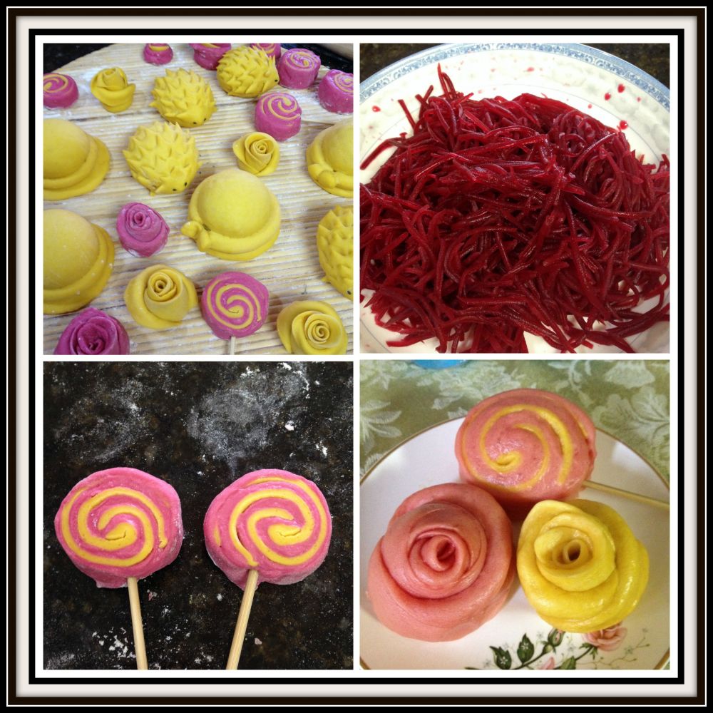 如果要作红颜色的玫瑰花可以用红菜头水和面。先把红菜头切丝,放些水进去,水就都成红色了,然后用这红水和面,具体步骤和上面的一样。你也可以把两种颜色的面圈在一起,查个小棍子,做成棒棒糖的样子,孩子们也会很喜欢的。