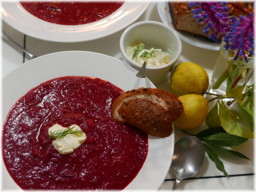 回来这罗宋汤,在俄语和乌克兰语里,它叫Борщ,波兰语叫Barszcz.由于英语里没有这个劳什子” щ”,所以便派生出几种不同的拼法: borsh, borshch, borsch or barszcz.它说穿了就是用红色的甜菜为主料,加入土豆,胡罗卜,牛肉丁(或汤汁),用奶油等来熬煮的紫红色浓菜汤.据说它最早发源于乌克兰.(俄罗斯人肯定不干了!)
