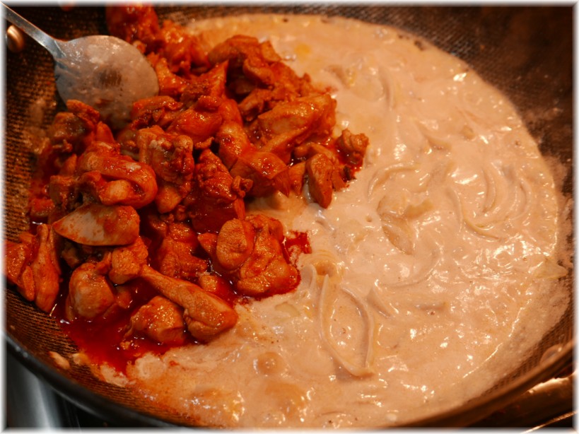 5.再盖上稍微煮一会儿后,锅里会浓稠起来.这时候,把备好的鸡块下去,再盖上煮一会儿(3分钟吧),之后熄火.成了.
