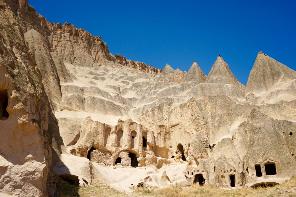 卡帕多西亚(Cappadocia)位于土耳其的中部,是个有神奇地貌的地方。这里山峦起伏,沟壑纵横,山谷中是一片片的石柱森林,冲天而立,形成独特的景观。从地质上讲,这个地区以前是活火山,岩浆冷却后形成厚厚的凝灰岩。在漫长的岁月中,凝灰岩被阳光风雨侵蚀,松软的部分逐渐剥蚀殆尽,而比较坚实的部分留下来,形成了千姿百态的岩石,即有绵延不绝的悬崖褶皱,也[