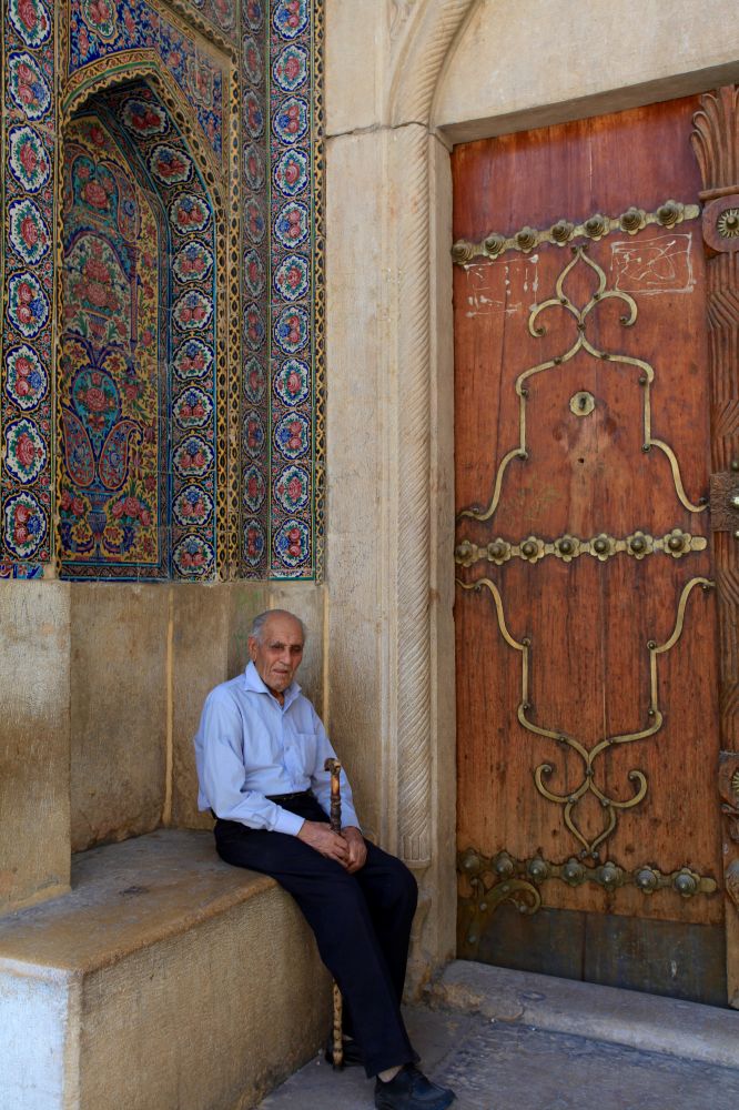 外墙上的彩釉瓷砖和入口处闲坐的老人