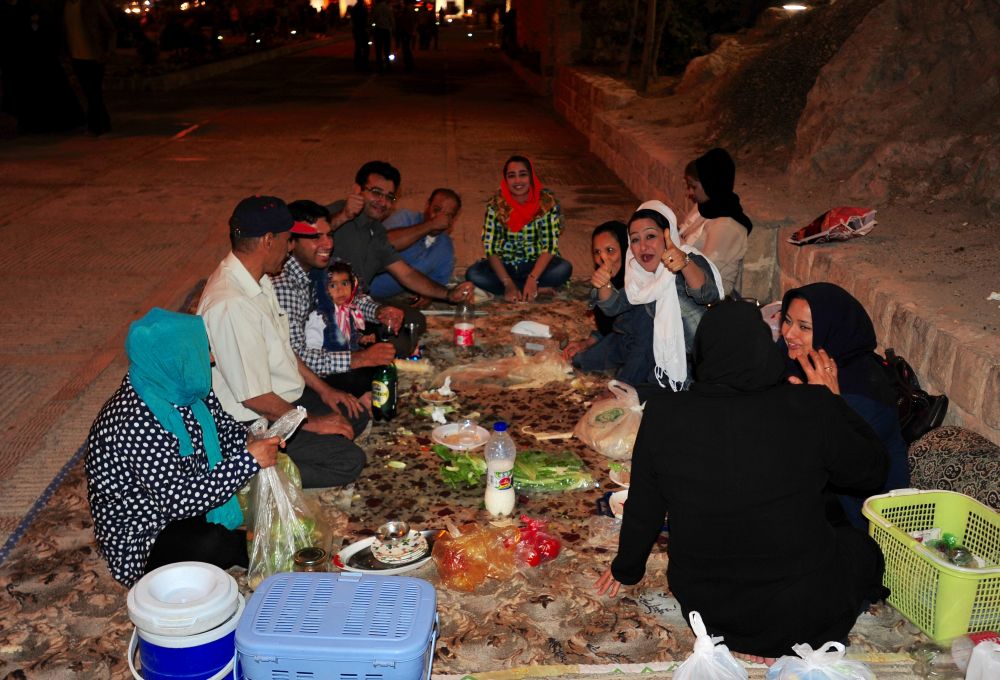 虽然今日的伊朗以教义为准绳,禁止了很多公共场合的娱乐,包括饮酒舞蹈,但户外的小聚依旧是很流行的休闲方式。这是古兰经门附近聚餐的当地人。