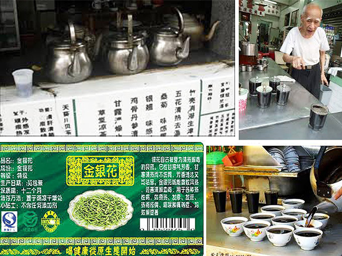 这香气诱人的金银花引起了我童年的记忆,小时候生活在南方,古人“喝涼茶,清热解毒去湿”的中医疗法贯彻到城里的毎个角落,大街小巷里随处可见“凉茶”两字,有带桌子板凳的店门被称为“凉茶舖”;有些人家住在路边,就在窗台摆上几杯凉茶出售。家里还有专用药物抽屉,塞满了各种各样的凉茶包。不管天凉天热,喝凉茶成了我们日常生活中的一部份。