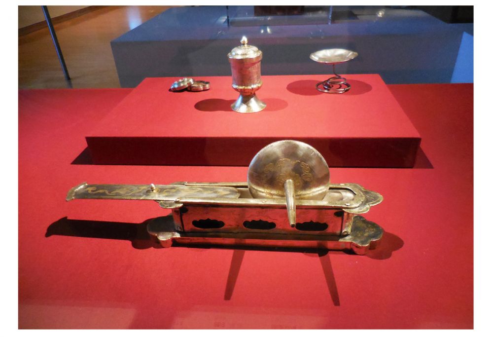 前面是鎏金坐佛纹云头银如意 874s;后面是如意长柄银手炉 872s