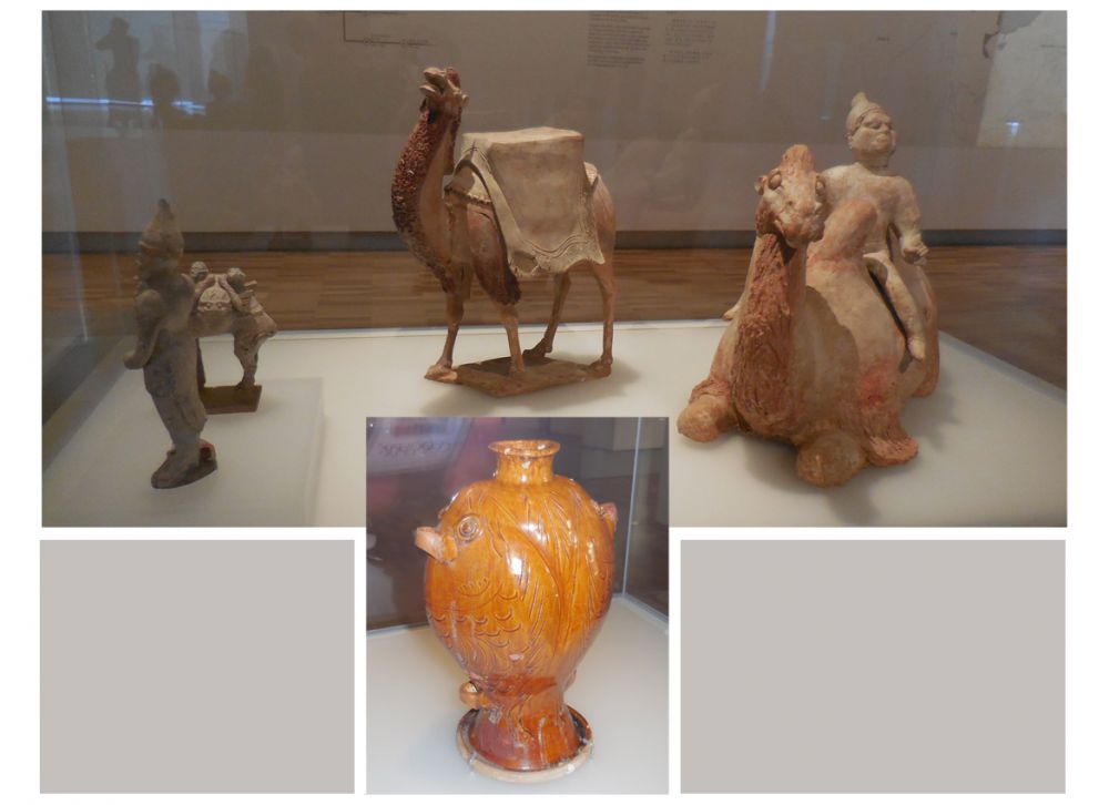 下图的上面:中间是骆驼俑 650 - 700s;右边是彩绘胡人骑卧驼俑 700s