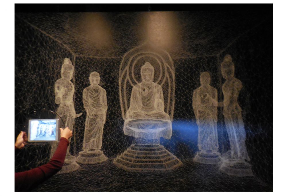 该展览的最后亮点 -《人间净土:走进敦煌莫高窟》,是让来者观看、用数码装置重现敦煌莫高窟中初唐佛教遗迹、第220窟的实场景。经过超高清晰度摄像和立体激光扫描技术的高科技处理,人站在复制的220窟内,手拿着这个像ipad大小的影像机,就可以清楚地看到原窟內的壁画和雕塑的彩色实景了。