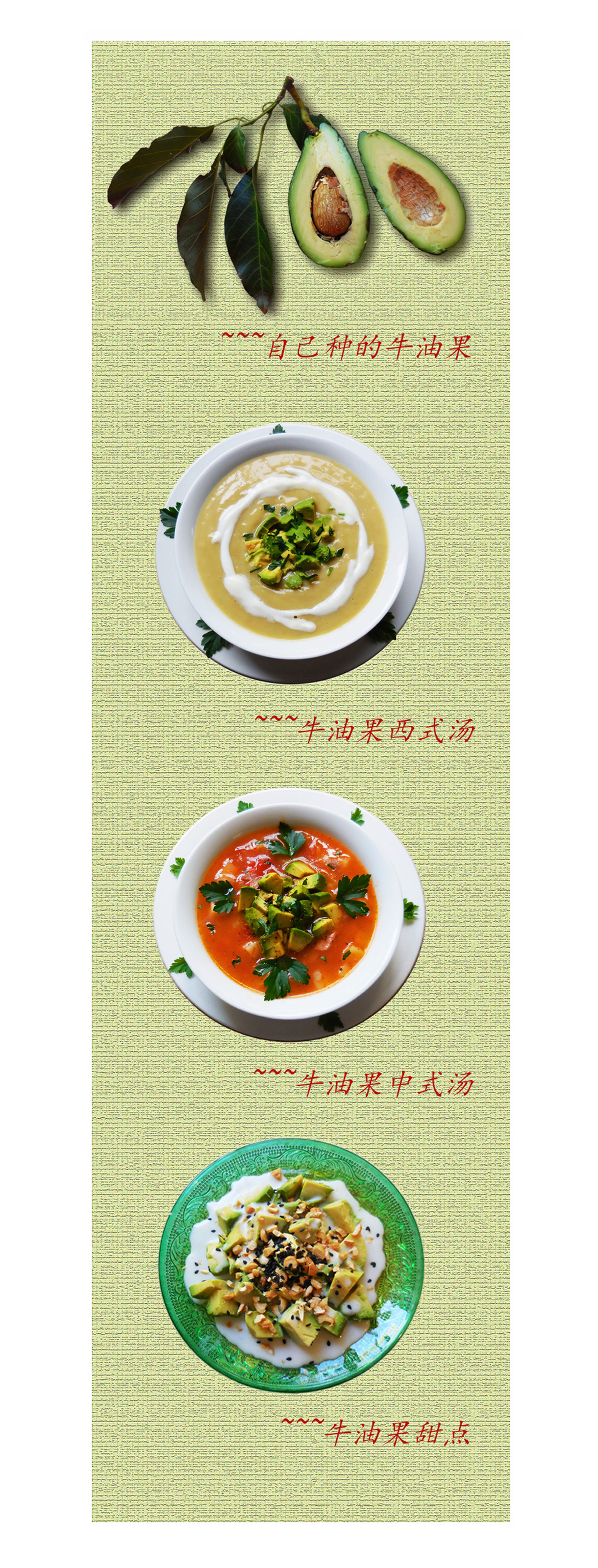 ~~~ 西式汤 — 用中式汤的汤料,待凉,加入半个或一个牛油果,放入搅拌机全部打搅至糊状,调味加香菜就可以喝了。冷喝时放入一小勺子无糖酸奶,另有风味。