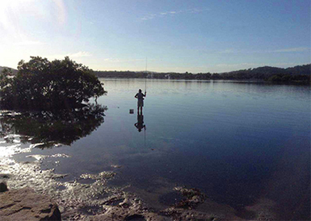 早上6点刚过晨光初现,我一个人在湖边走着,偶然有骑单车的人在身边飞过。平静的湖面里,有一条鱼在我的眼前冒泡,然后又跳出水面。鱼跳得很高,我伸出双手去接,它竟然突然长出翅膀,绕着我一圈飞走了。我继续向前走,又见前面坐着一个钓鱼老翁,他的钓竿成弧形弯向水里,老翁在使劲地把鱼竿向上提,有大鱼了?我跑近一看,是书,老翁钓起了一本书!我叫着,给我,给我,然后抬起脚一步跨进水里……,一下子惊醒了,原来是在做梦!(拍到湖面的垂钓者)