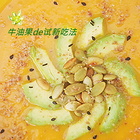 煮熟的南瓜加入一点牛奶或者鸡汤、盐,搅拌成糊状,然后放上牛油果、炒香的南瓜子,糊状的瓜汤和不是太熟的牛油都非常滑口,用香脆瓜子仁增加一点咬劲,撒上一点胡椒粉,一点亚麻子粉Linseed meal、黑芝麻,这碗南瓜汤有点不同喔,然后就大口地喝~~~。