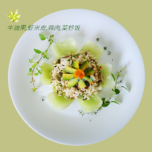 从小到大都离不开吃炒饭,现在就做牛油果伴炒饭。先用现成的酱油鸡肉,把它切小粒,再切一些四季豆,蔬菜,抓一把白虾米皮一起炒饭,虾米皮的咸香很惹味。摆盘时先放上过了开水的小棠菜梗,然后放炒饭、牛油果、半个小番茄和一些牛至香草Oragona,既作装饰也与炒饭同吃。