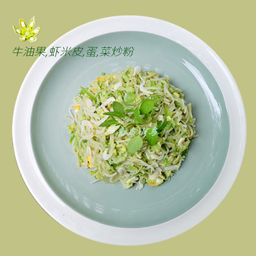 炒好米粉之后,将牛油果泥和米粉轻混合,再撒上香料/菜就可以上桌了。这盘米粉因为有牛油果吃起来有一点粘滑,但虾米皮的咸香干硬能嚼咽出特别的口感和味道。如果看客喜欢可以改用炒面,干炒面而不是湿炒以适合和牛油果泥做伴侣。
