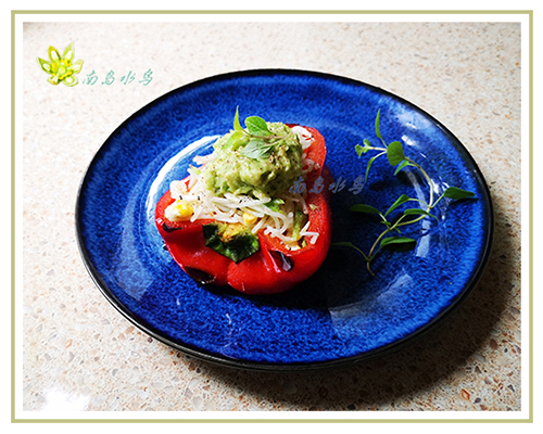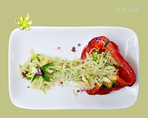 用大辣椒做盘子时,炒好的米粉不要混合牛油果泥,把牛油果泥放在炒粉上面,吃时混合炒粉一起吃。