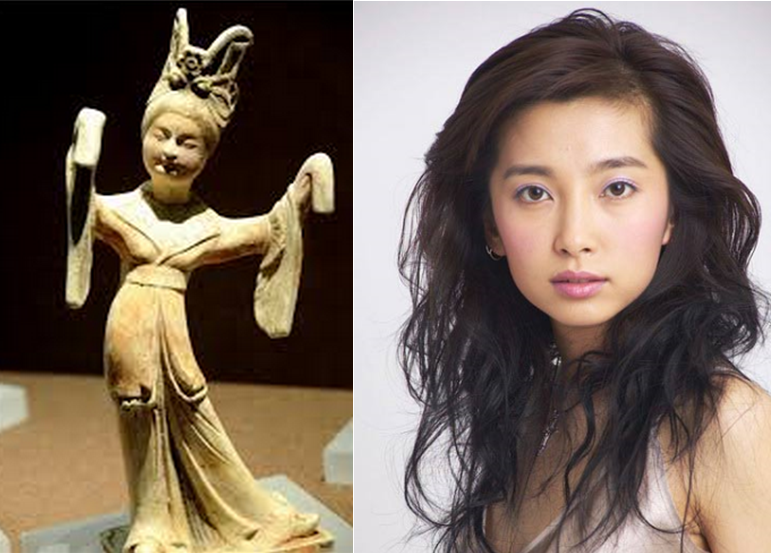 双鬟望仙髻的舞俑。翻领胡服长及膝盖,两层襦裙,内层是条纹的间色裙,外层开衩。这个搭配十分独特,从未有过。舞姿舒展优美,面如满月,长的有点象李冰冰刚出道时的模样。