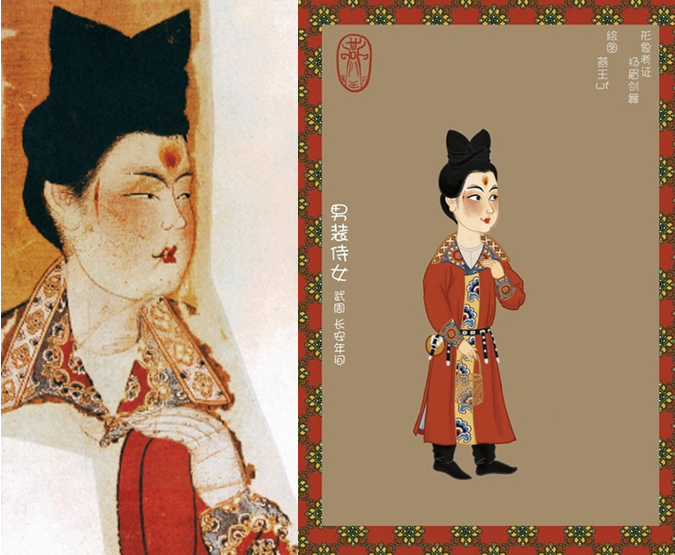 画于704年的胡服美人图。新疆阿斯塔那出土。绢本设色,应是屏风画残片。人物为舞伎。惊鹄髻,面颊丰腴,额描桃花瓣花钿,颊边月芽型斜红,神态端庄,穿花团窠锦袖翻领胡服。