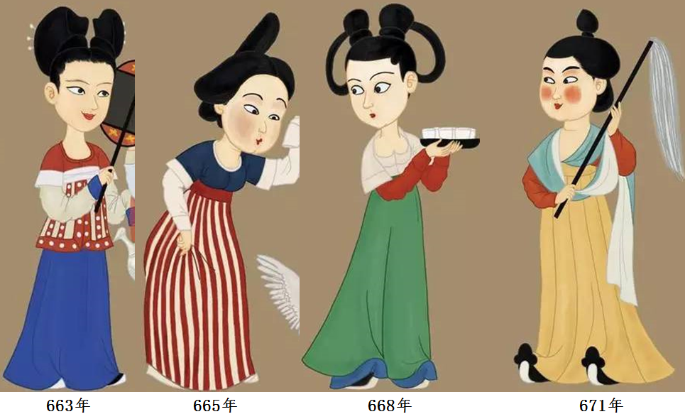 自她14岁入宫,到她82岁去世,六十余年间唐朝宫廷美人的装束变化(绘图: 燕王WF):