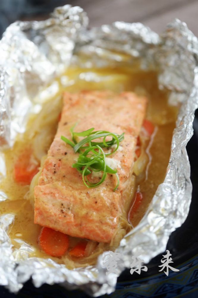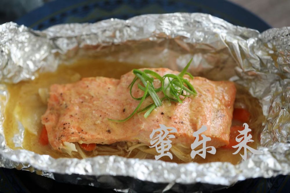 一个平底锅,几张锡纸,呈现的鱼肉鲜嫩,蔬菜原汁原味吸满了鱼汁,最后的黄油或者猪油画龙点睛又绝对不喧宾夺主,孩子们爱三文鱼,更是大口吃完了底下的蔬菜。这道菜味道不要太嗲啊