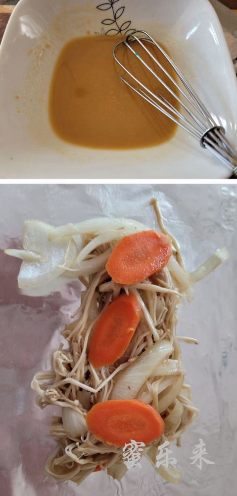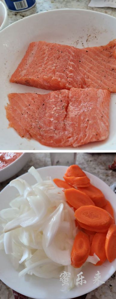 材料:三文鱼段总重量600克,大洋葱半个200克,胡萝卜一根切片,金针菇一包