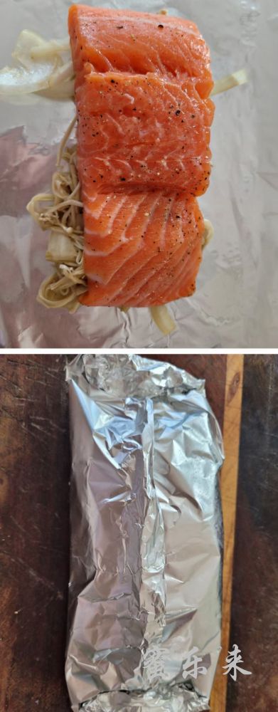 4. 蔬菜上面放上三文鱼,先把锡纸大约折叠一下四周