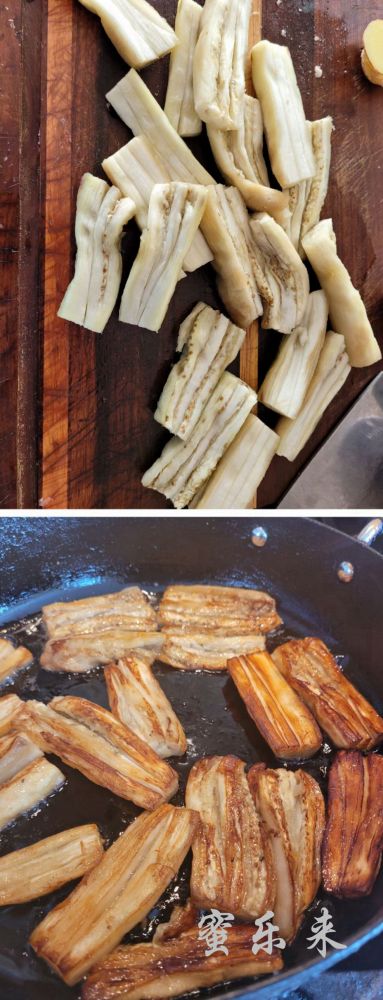 4. 锅里底油,中大火煎茄子,煎到两面金黄