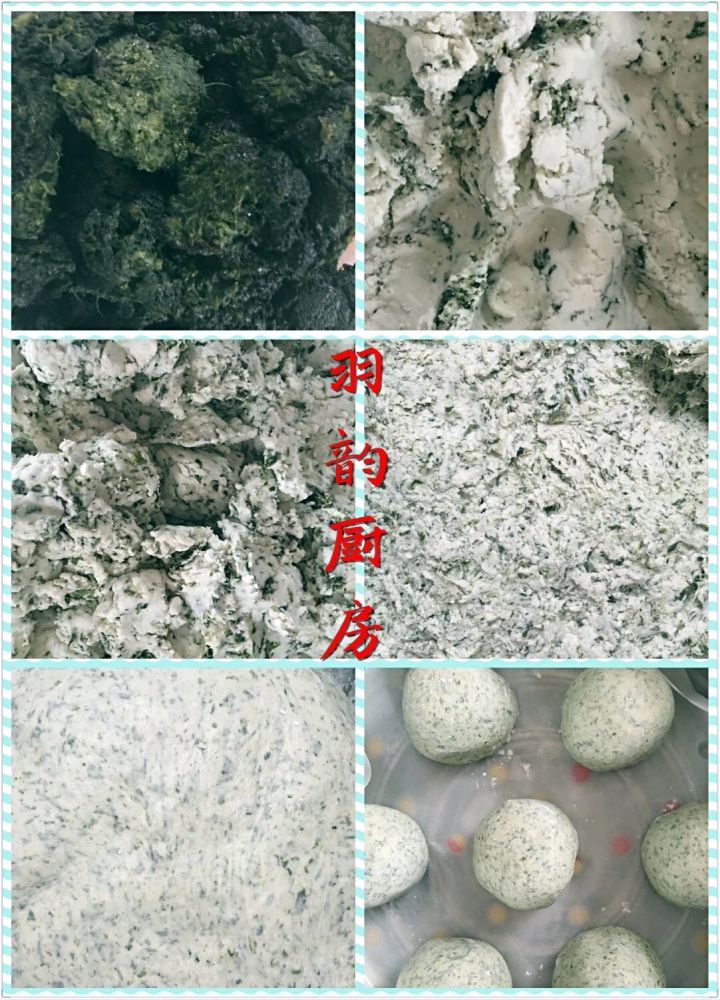 青团的做法:野菜泥倒入容器里,加入适量糯米粉揉匀成光滑的面团,然后分成大小相近的小剂子包入红豆沙馅搓圆成团子或者压扁成饼子。
