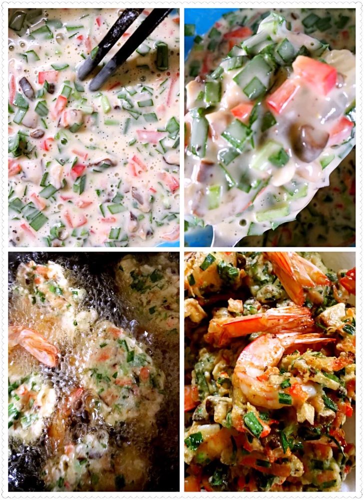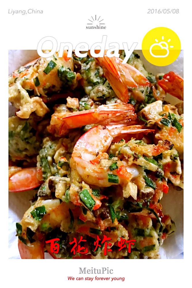 百花炸虾~~材料:新鲜大虾12只、水发香茹2个、彩椒1/3、韭菜或香葱少许。调料:料酒、盐、白胡椒粉、鸡蛋1个、面粉2汤匙。操作:虾洗干净,留尾剥壳去头,用刀划背去虾线,处理好的虾用料酒、白胡椒粉、盐搅拌均匀腌制备用。做裹料:2汤匙面粉加入鸡蛋一个、切碎的彩椒韭菜香茹末和适量清水搅拌成糊状。腌制入味的虾裹上面糊入油锅炸至金黄色捞出控油即可。