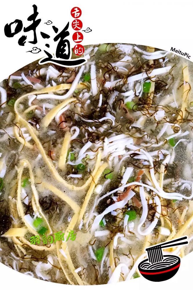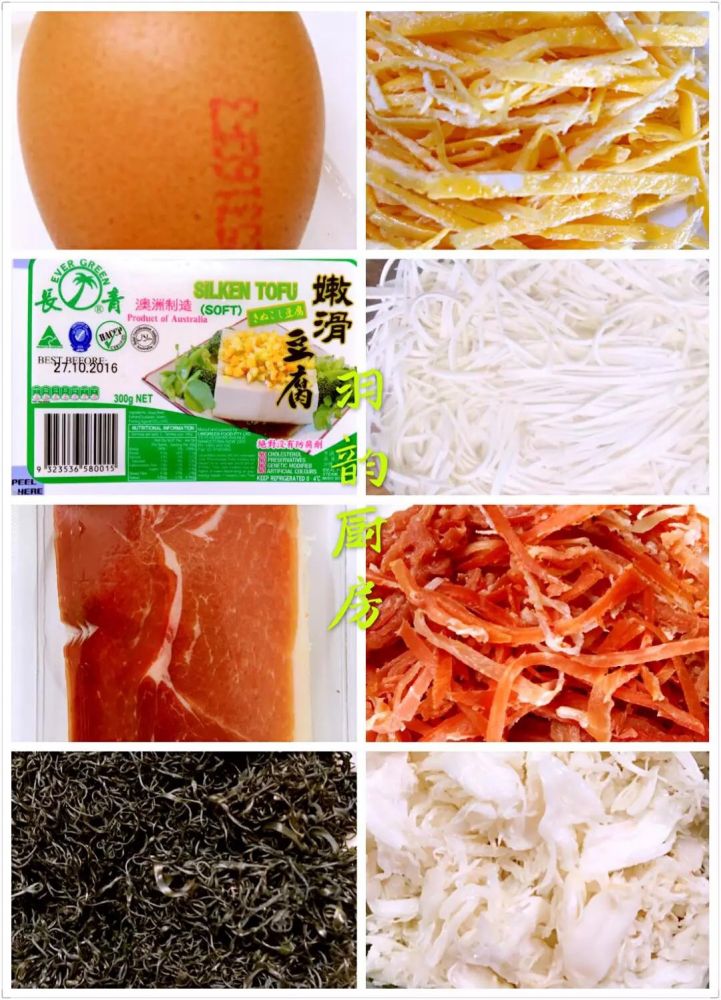 做法:所有材料洗净均切丝,(鸡蛋先摊成蛋皮),豆腐切丝必须泡入水中。
