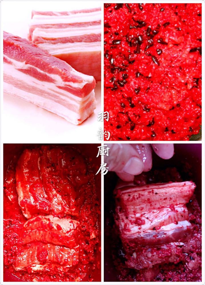 1,五花肉洗净、沥干水分切大块,加姜末、蒜末、料酒、白胡椒粉、5勺红糟拌匀封上保鲜膜,放入冰箱中,冷藏约24小时,待入味备用;