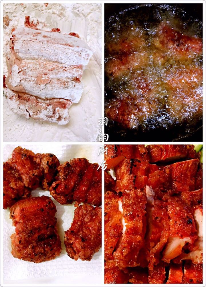2,取出腌制好的红糟肉,将肉表面多余的红糟刮除,均匀沾裹上地瓜粉,放置约10分钟左右;3,热油锅,待油温烧热至约150℃时,放入红糟肉,用小火慢慢炸,炸至快熟时,转大火略炸逼出油份,再捞起用厨房纸吸一下油;